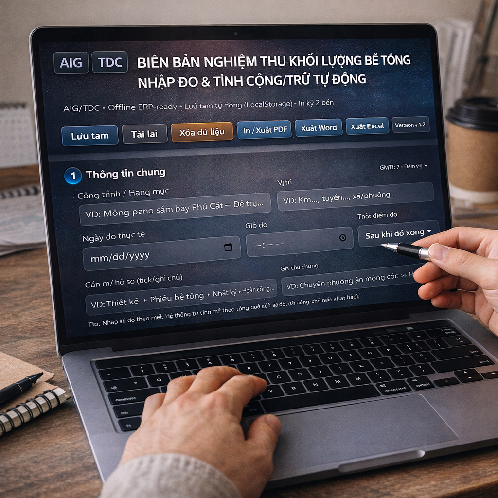 Múi giờ: GMT+7 • Đơn vị: m, m², m³Tip: Nhập số đo theo mét. Hệ thống tự tính m³ theo từng dòng, tự cộng (và trừ phần lỗ/ống chờ nếu khai báo).