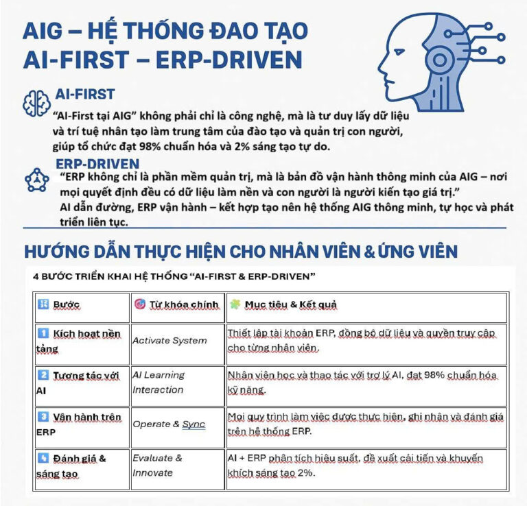 AI -FIRST & ERP DRIVEN “ AI CHATBOT HƯỚNG DẪN , ĐÀO TẠO CHUYÊN MÔN & ERP -DRIVEN – HƯỚNG DẪN THỰC HIỆN THEO QUY TRÌNH/ FORM / ỨNG DỤNG CÔNG CỤ=> GIẢM LÀM VIỆC THỦ CÔNG LÊN TỚI 98% VÀ TƯƠNG TÁC / Ý TƯỞNG / ĐỔI MỚI SÁNG TẠO PHỤ THUỘC VÀO CÁ NHÂN 2% KHÔNG BỊ BỎ LẠI PHÍA SAU.