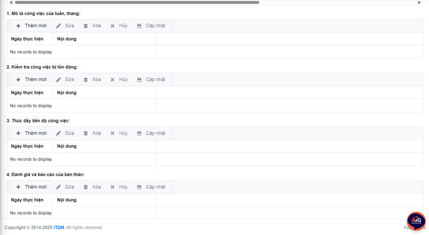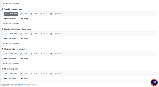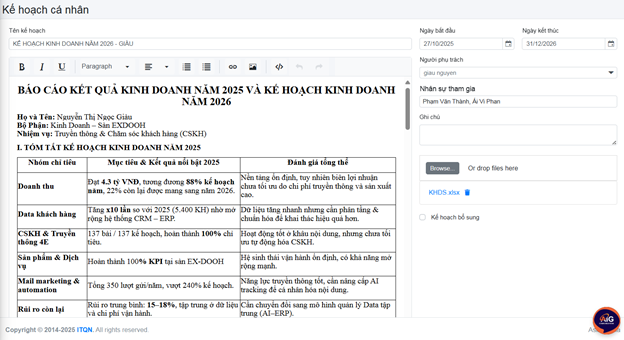 Trong thời gian này, mỗi thành viên sẽ chủ động cập nhật mục tiêu công việc, định hướng phát triển năng lực, lộ trình cải tiến hiệu suất và các đề xuất nhằm nâng cao hiệu quả đóng góp. Hệ thống ERP sẽ ghi nhận, nhắc lịch và theo dõi tiến độ nộp kế hoạch, đảm bảo tính liên tục và minh bạch trong vận hành.