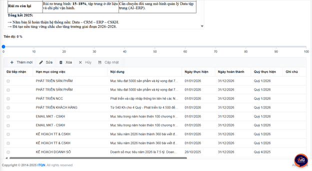 • 📅 Tự động xây dựng Action Plan chi tiết theo quý – tháng – tuần, liên kết trực tiếp với module KPI và dashboard hiệu suất.