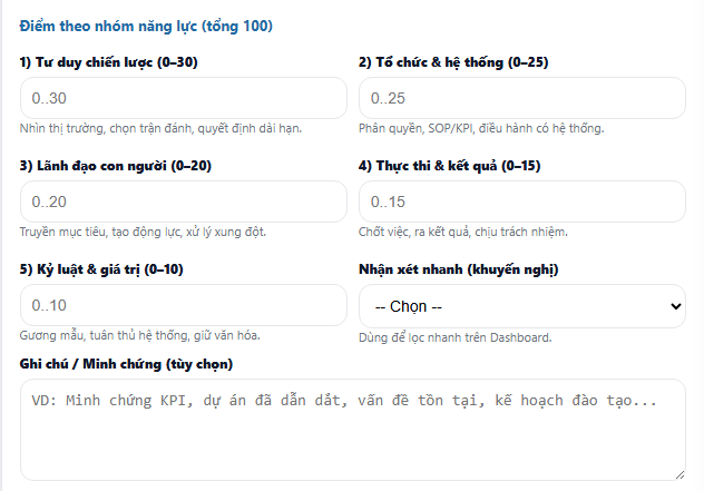 Form nhập liệu – Đánh giá năng lực lãnh đạo/quản lý