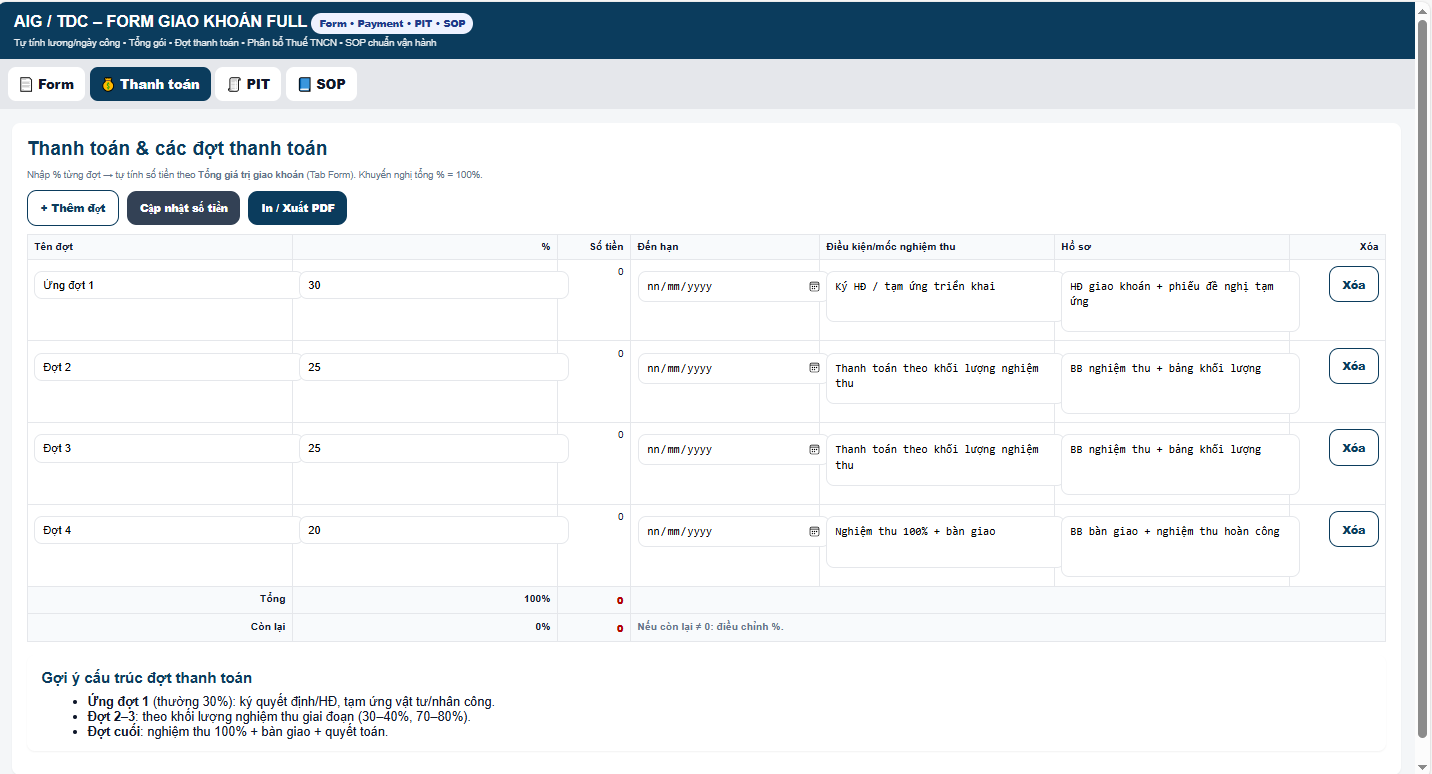 Để giải quyết triệt để những điểm nghẽn này, AIG và TDC đã chính thức triển khai Form Giao Khoán FULL – một công cụ quản trị giao khoán toàn diện, tích hợp Form – Thanh toán – Thuế TNCN (PIT) – SOP vận hành trong một hệ thống duy nhất