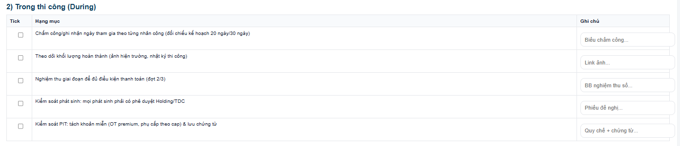 During: kiểm soát chấm công, theo dõi khối lượng thực hiện, nghiệm thu theo từng giai đoạn, giúp quản lý tiến độ và chất lượng công việc trong suốt quá trình thi công.