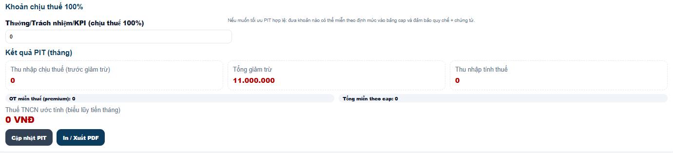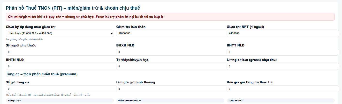 | Kiểm soát PIT: tách khoản miễn (OT premium, phụ cấp theo cap) & lưu chứng từ |