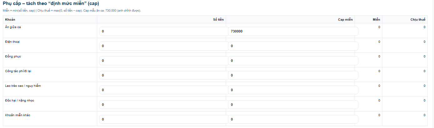 Phụ cấp – tách theo “định mức miễn” (cap)