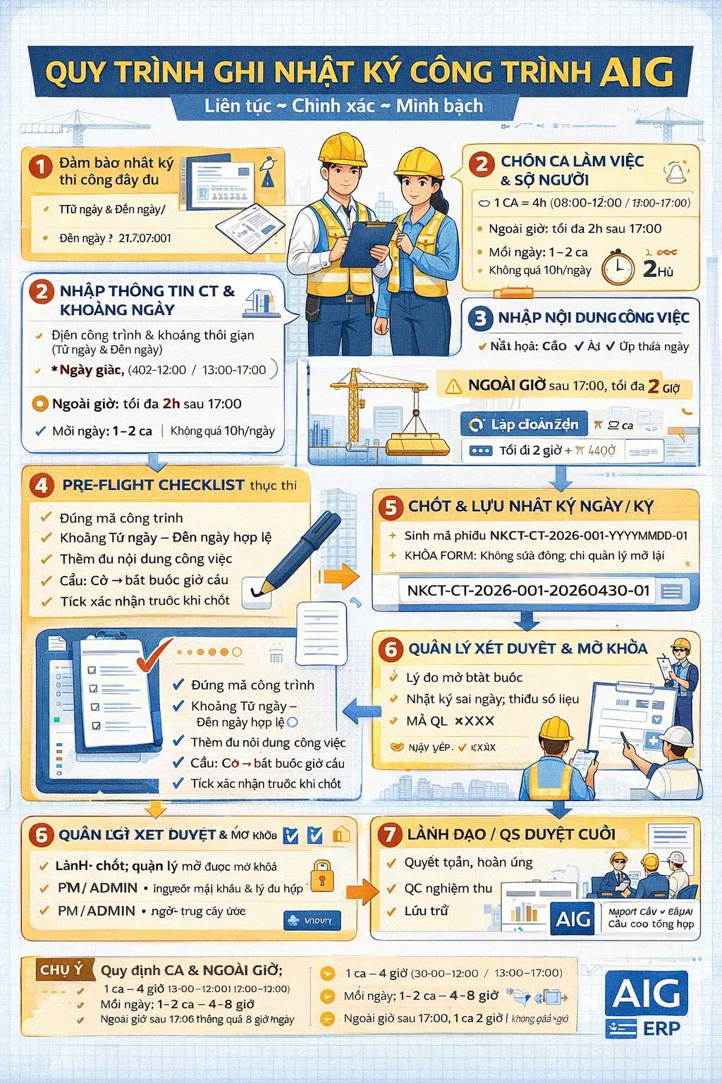 Đó chính là lý do AIG Communications chính thức triển khai Hệ thống Nhật ký Công trình (NKCT) – phiên bản v2.1, như một nền tảng vận hành cốt lõi trong chuỗi thi công – nghiệm thu – quyết toán – đối soát nội bộ.