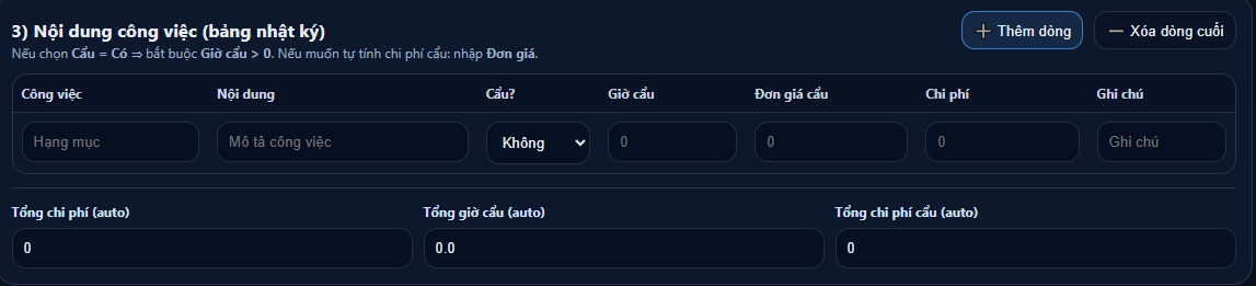 | Công việc | Nội dung | Cẩu? | Giờ cẩu (BĐ / KT) | Đơn giá (VNĐ/giờ) | Chi phí |