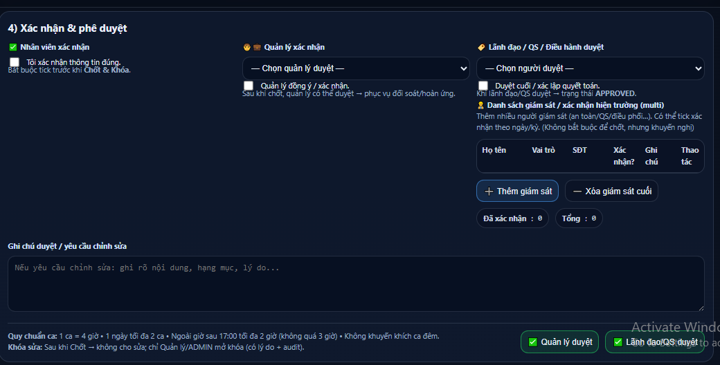 Quy trình duyệt nhiều cấp (Quản lý – Lãnh đạo/QS) đảm bảo mỗi bộ hồ sơ nhật ký đều có giá trị pháp lý nội bộ, đủ điều kiện phục vụ thanh quyết toán và kiểm toán sau này.