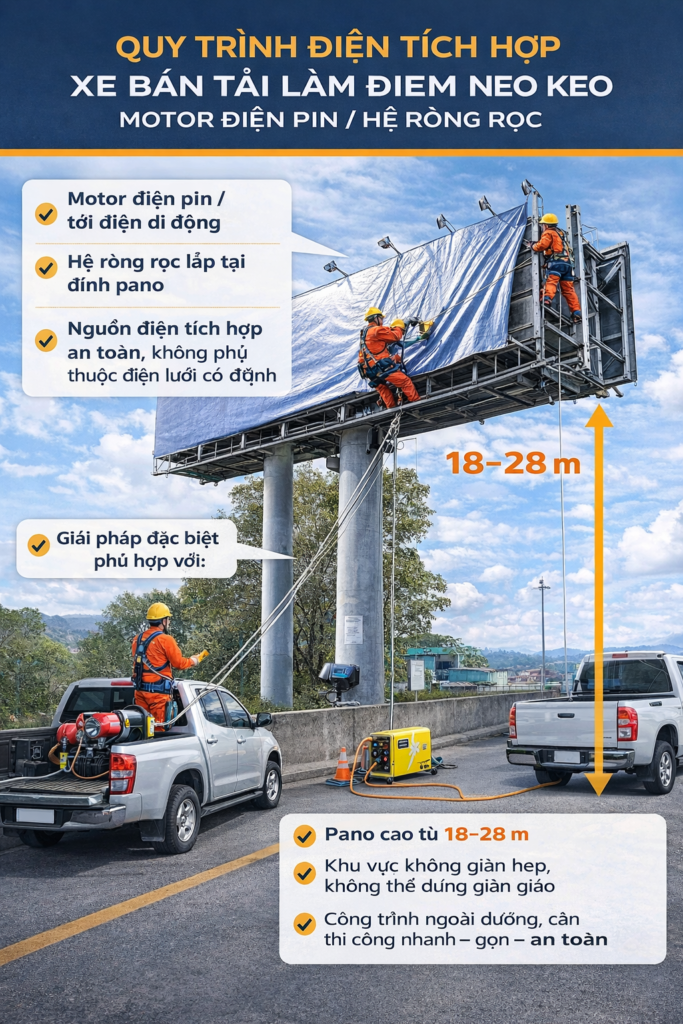 Quy trình điện tích hợp sử dụng xe bán tải làm điểm neo kéo bạt lên pano là bước cải tiến quan trọng trong thi công billboard tại TDC, giúp nâng cao an toàn lao động, giảm phụ thuộc sức người và tối ưu thời gian triển khai trong điều kiện công trường thực tế.