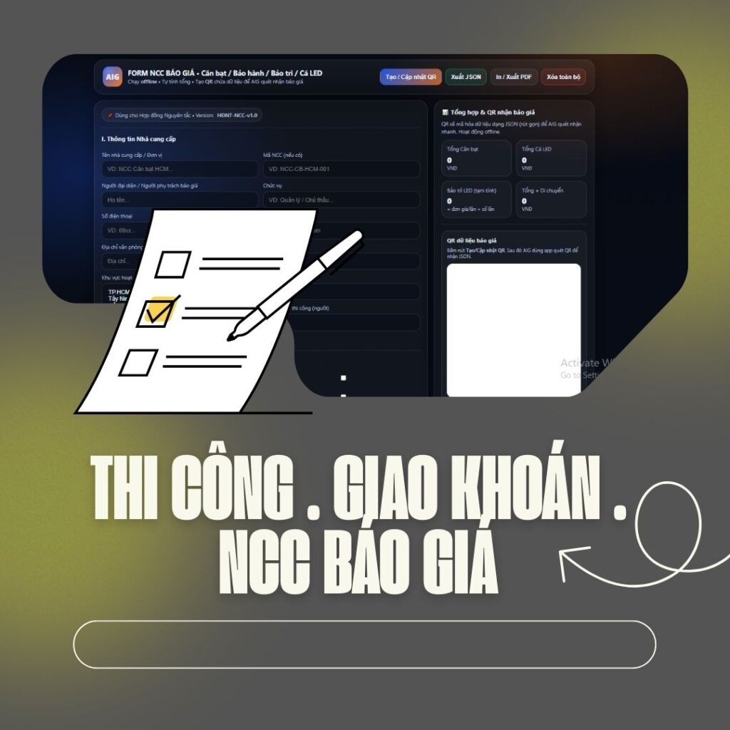 Từ bài toán đó, AIG phát triển Form Nhà Cung Cấp Báo Giá Căn Bạt – Bảo Hành – Bảo Trì – Cá LED (Offline, ERP-Ready):