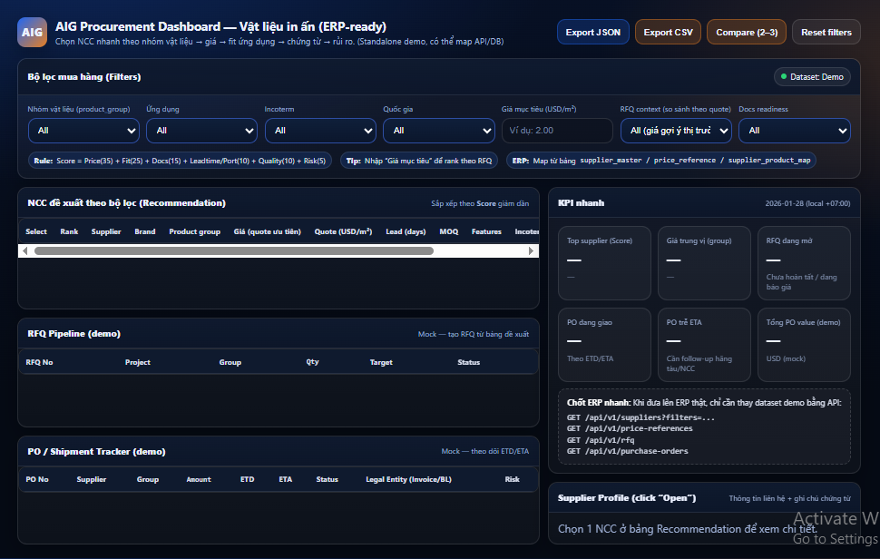 Dashboard của AIG được xây dựng theo logic ERP-ready, trong đó mỗi nhà cung cấp được chuẩn hóa theo các lớp dữ liệu: